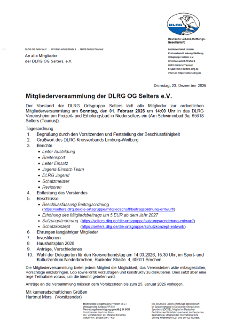Der Vorsitzende der DLRG Ortsgruppe Selters lädt alle Mitglieder zur ordentlichen Mitgliederversammlung am Sonntag, dem 01. Februar 2025 um 14:00 Uhr in das DLRG Vereinsheim am Freizeit- und Erholungsbad Niederselters ein (Am Schmimmbad 3a, 65618 Selters (Taunus)).