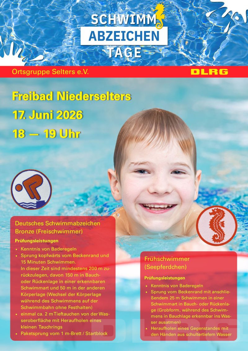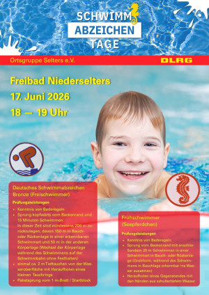 Wer am 17. Juni 2026 keine Zeit hat, kann an jeden anderen Mittwoch zwischen 18:00 und 19:00 Uhr im Freizeit- & Erholungsbad Niederselters bei der DLRG OG Selters e.V. vorbeischauen und dort die Prüfung zu einem der Deutschen Schwimmabzeichen Bronze, Silber und Gold oder zum Frühschwimmerabzeichen Seepferdchen ablegen.